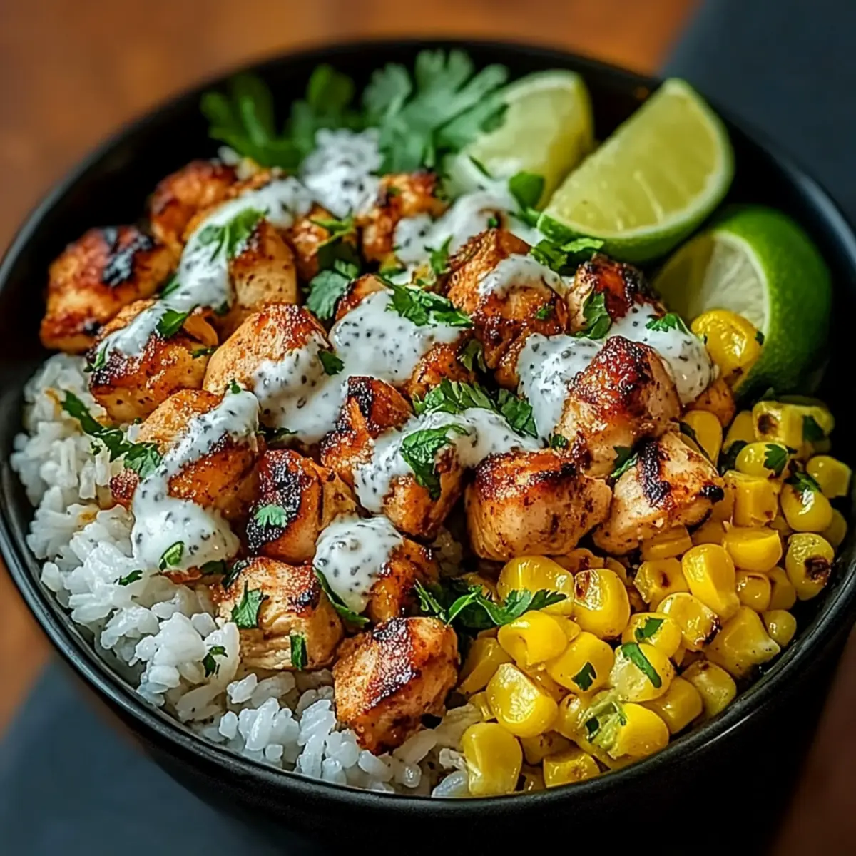 Assemble Bowls: In individual bowls, start layering with a base of rice followed by the sautéed chicken, the street corn mixture, black beans, and a sprinkle of diced avocado on top.
